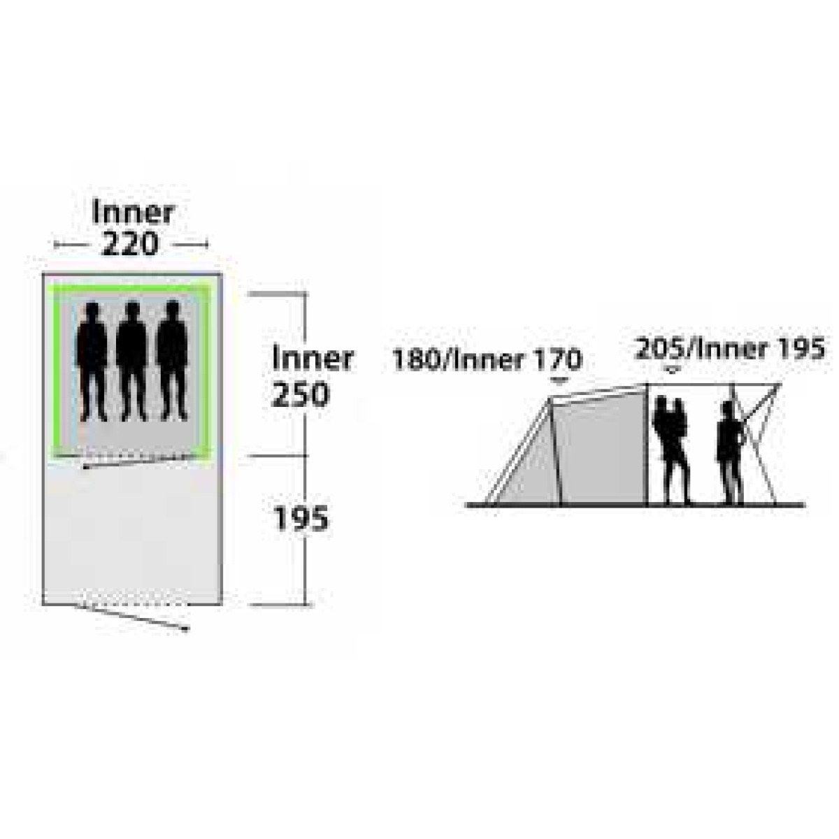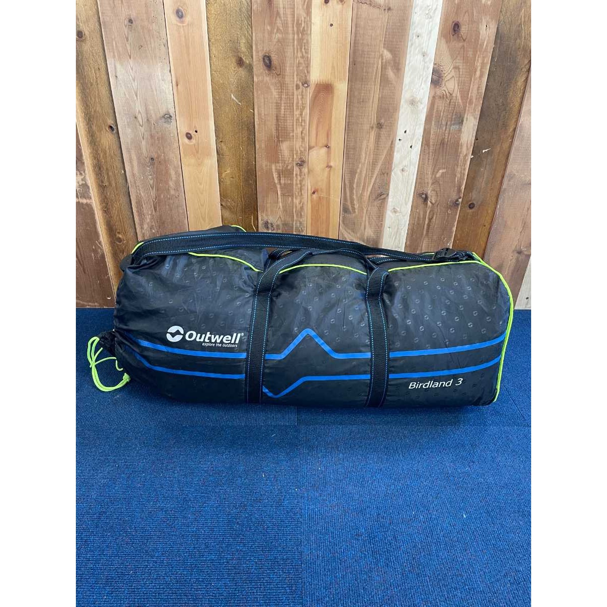 Outwell Birdland 3 person tent, 445 x 220 x 205cm outer dimensions, 32 x 75cm packed dimensions. Contains mallet