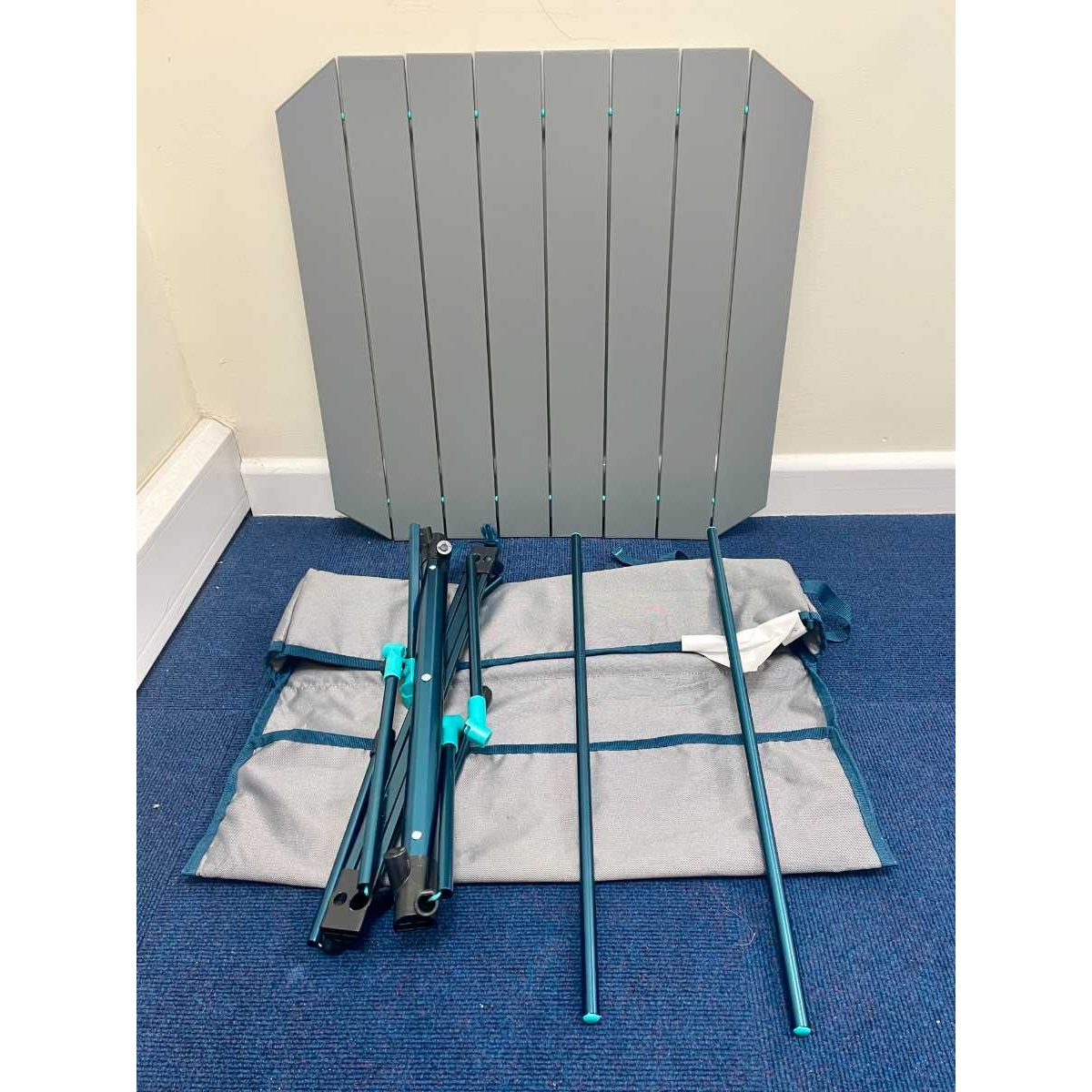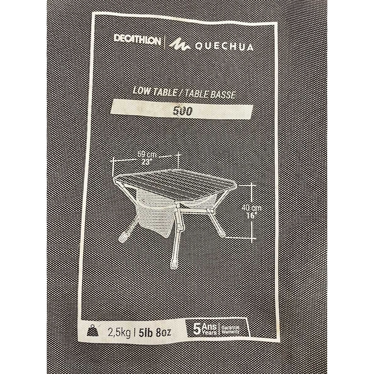 Table - low folding camping style. 59cm square table surface. 40cm high. Weight 2.5kg.